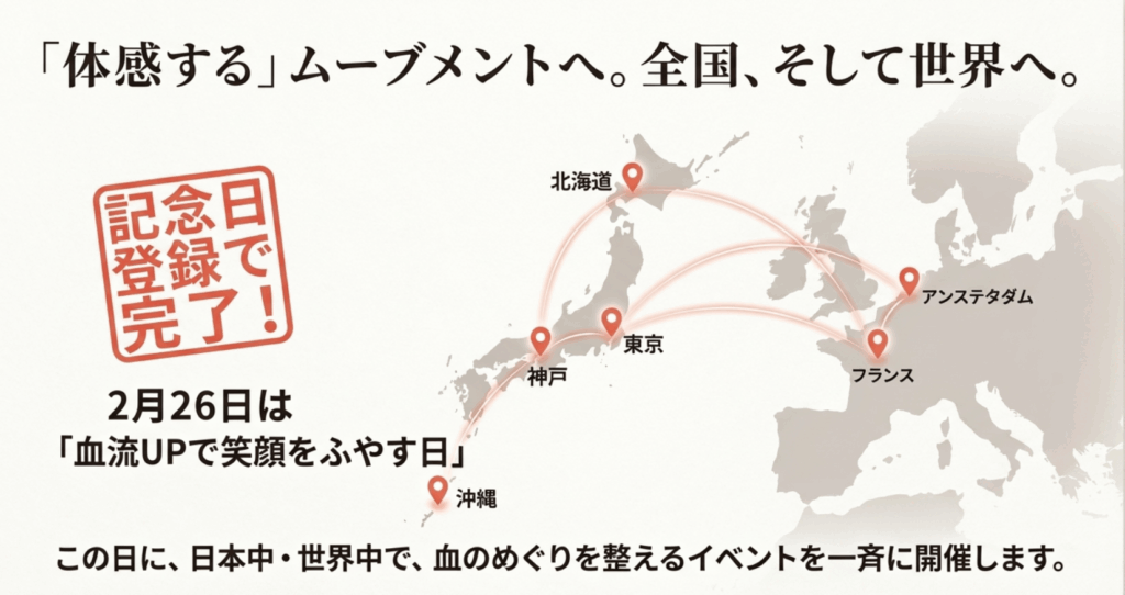 そして嬉しいことに、この想いに共感してくれた日本中・世界中の仲間たちが立ち上がり、この記念日に合わせて、あなたが実際に血流アップを「体感」できる特別な場を用意してくれました。