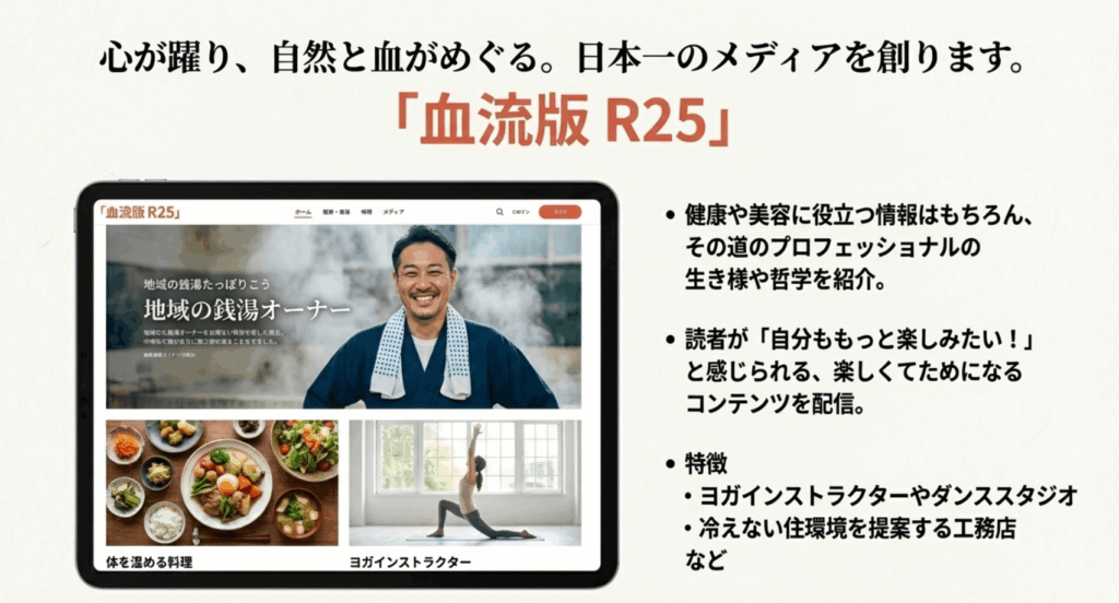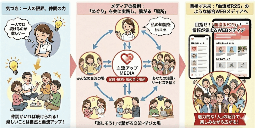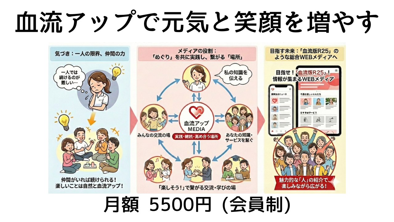 血のめぐりだけでなく、人のつながりも、お金も、循環する。ワクワクしながら、気がついたらからだも心も元気。仲間も増えて、人生がより豊かに楽しくなった。そんな血流アップメディアが必要ではないでしょうか。