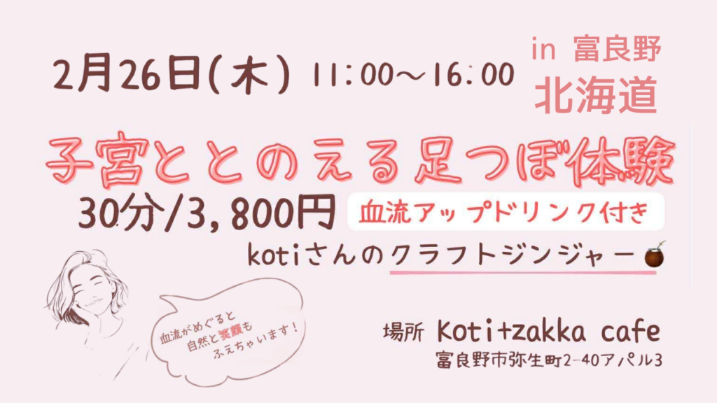 - 【北海道・富良野】2月26日(木)|子宮ととのえ足つぼ × 特製クラフトジンジャー 足裏からバランスを整える足つぼと、特製ジンジャーで内側からポカポカに。自分へのご褒美タイムを!