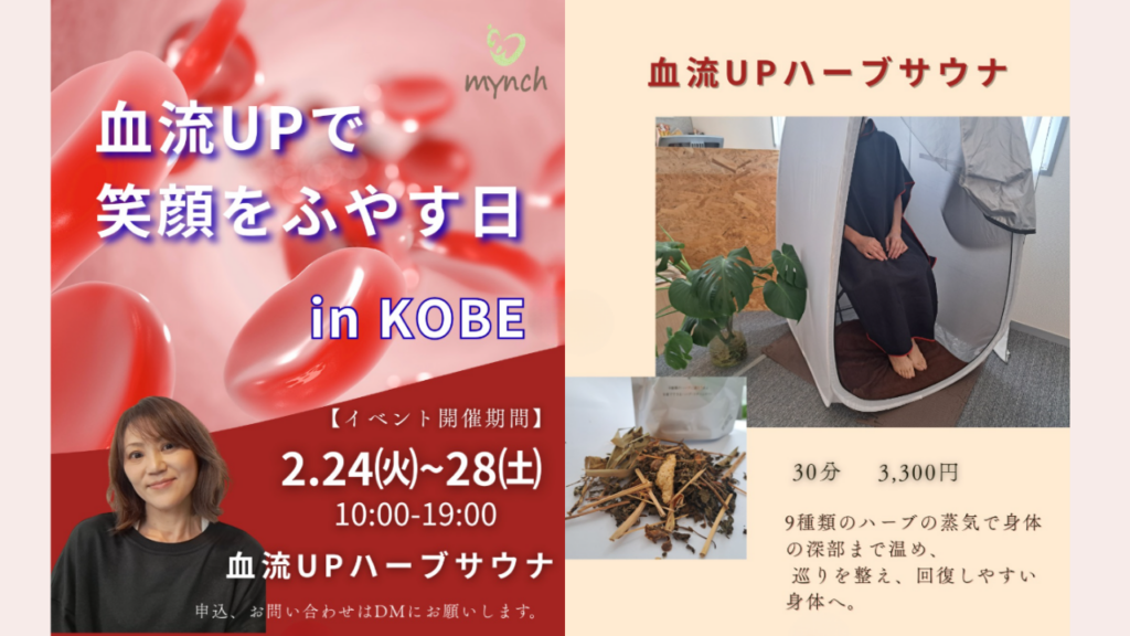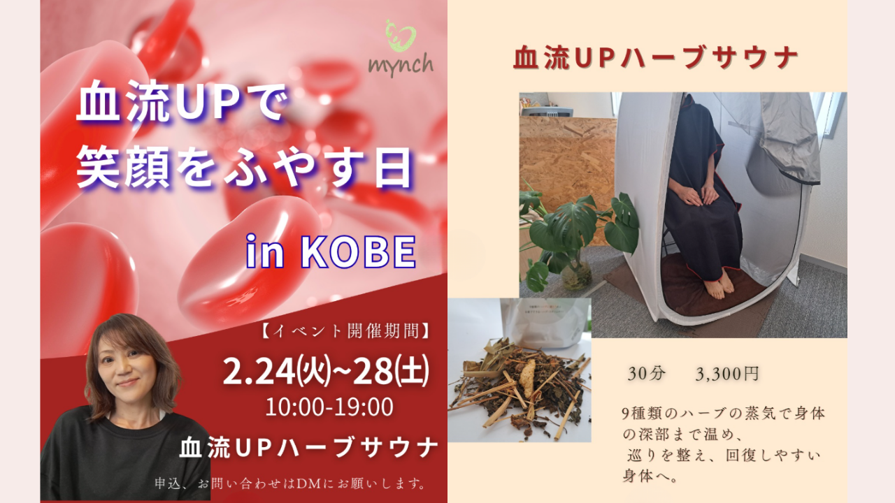 - 【兵庫・神戸】2月24日(月)〜28日(金)|ハーブサウナで深部から温めて血流アップ スポーツ整体の見識を持つセラピストが、30分のハーブの蒸気で深部を温め、抜けない疲れをリカバリー!