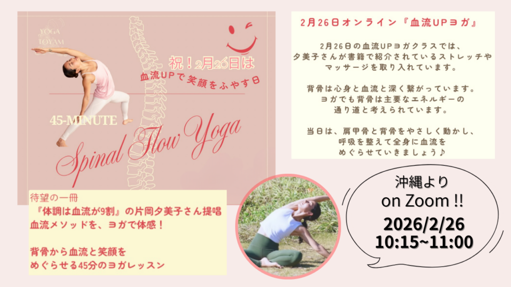 - 【沖縄発/オンライン】2月26日(木)|背骨から血流を整える、45分間のスペシャルヨガ 骨格の仕組みを活かしたアプローチで、初心者の方もご自宅からZoomでリラックスしてご参加いただけます!