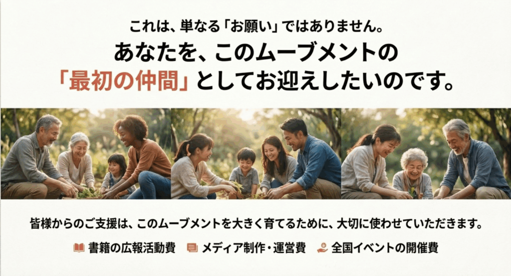 これは、単なる資金集めのお願いではありません。 あなたを、このムーブメントを共に創り上げる最初の仲間としてお迎えしたいのです。