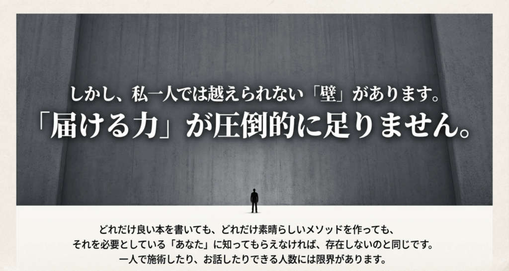 ですが、私には圧倒的に届ける力が足りません。 どれだけ良い本を書いても、どれだけ素晴らしいメディアの構想があっても、それを必要としているあなたに知ってもらえなければ、存在しないのと同じです。