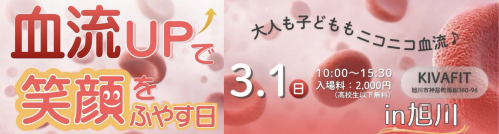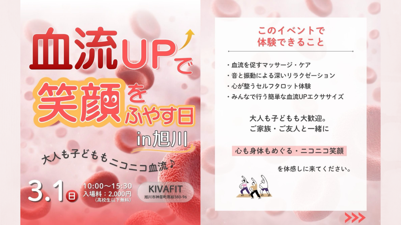 - 【北海道・旭川】3月1日(日)|心身を軽やかに整える「血流アップDay」 マッサージ、音と振動のリラクゼーション、セルフタロットなど、多彩なアプローチでめぐりをサポート!