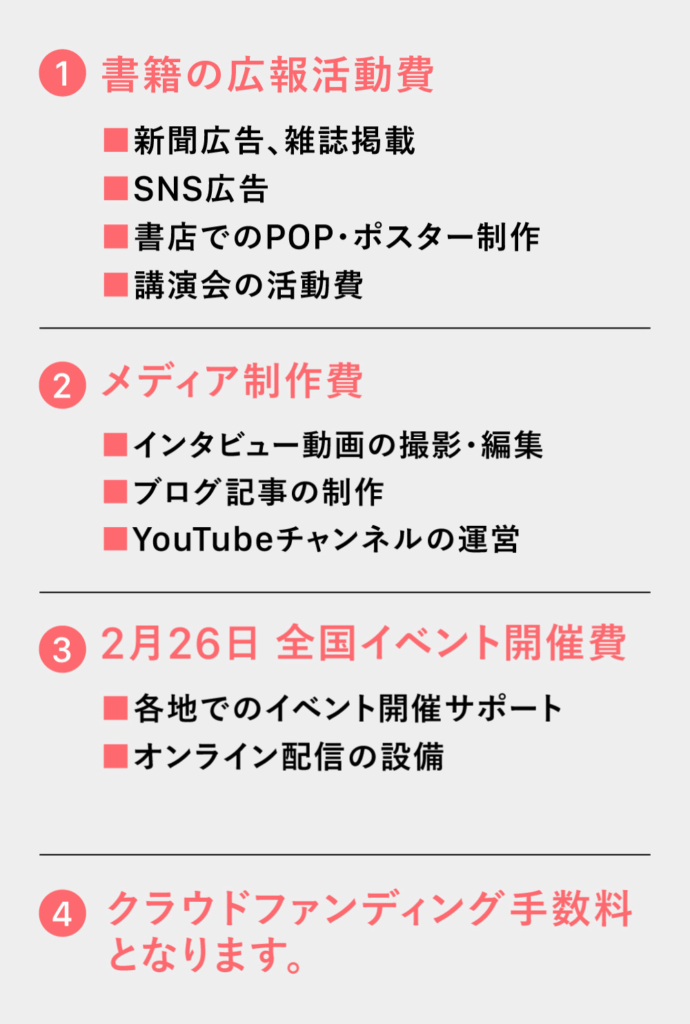 皆様からのご支援は、書籍の販促・メディア制作費・イベント運営費などに、大切に使わせていただきます。